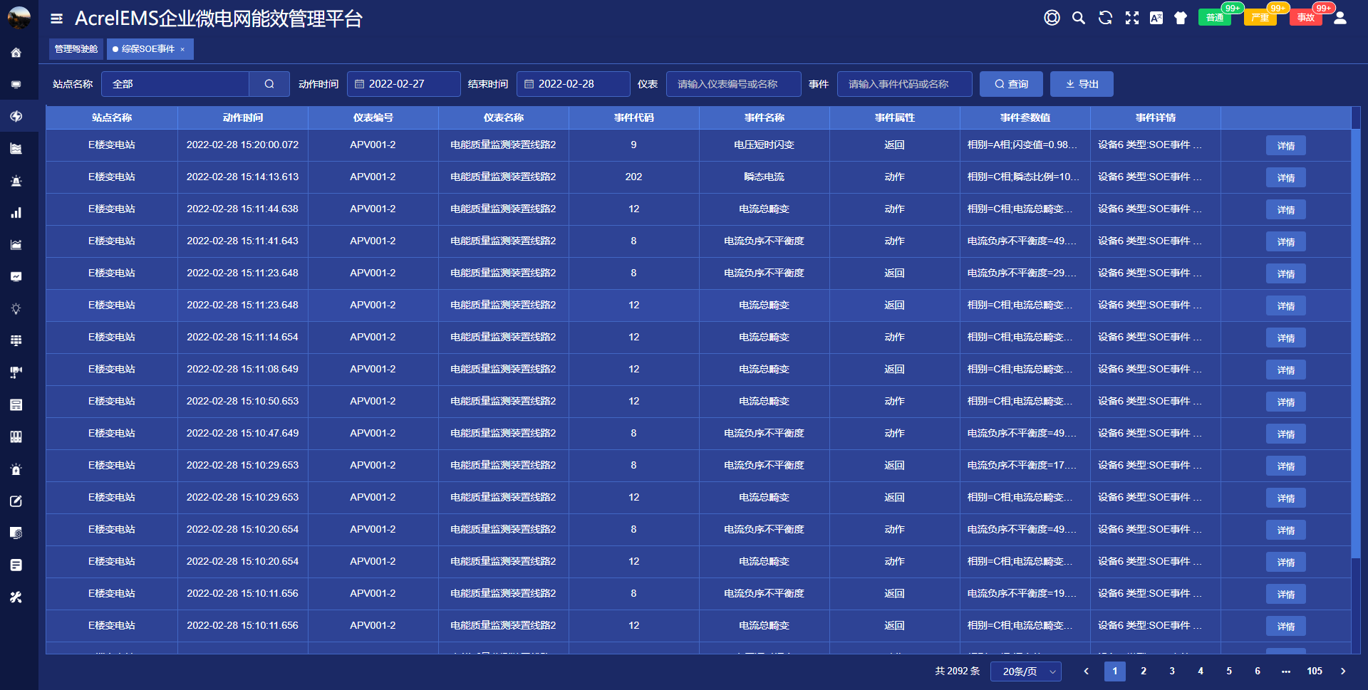 电力监控系统能够对遥信变位,保护动作、事故跳闸,以及电压、电流、功率、功率因数越限等事件记录进行存储和管理,方便用户对系统事件和报警进行历史追溯,查询统计、事故分析。