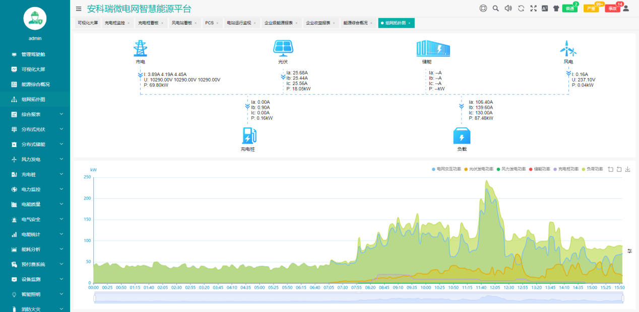 综合监控:实现园区变电站、光伏、储能、负荷、充电桩、环境数据的采集、监测、可视化展示、异常告警、事件查询、报表统计等功能;
